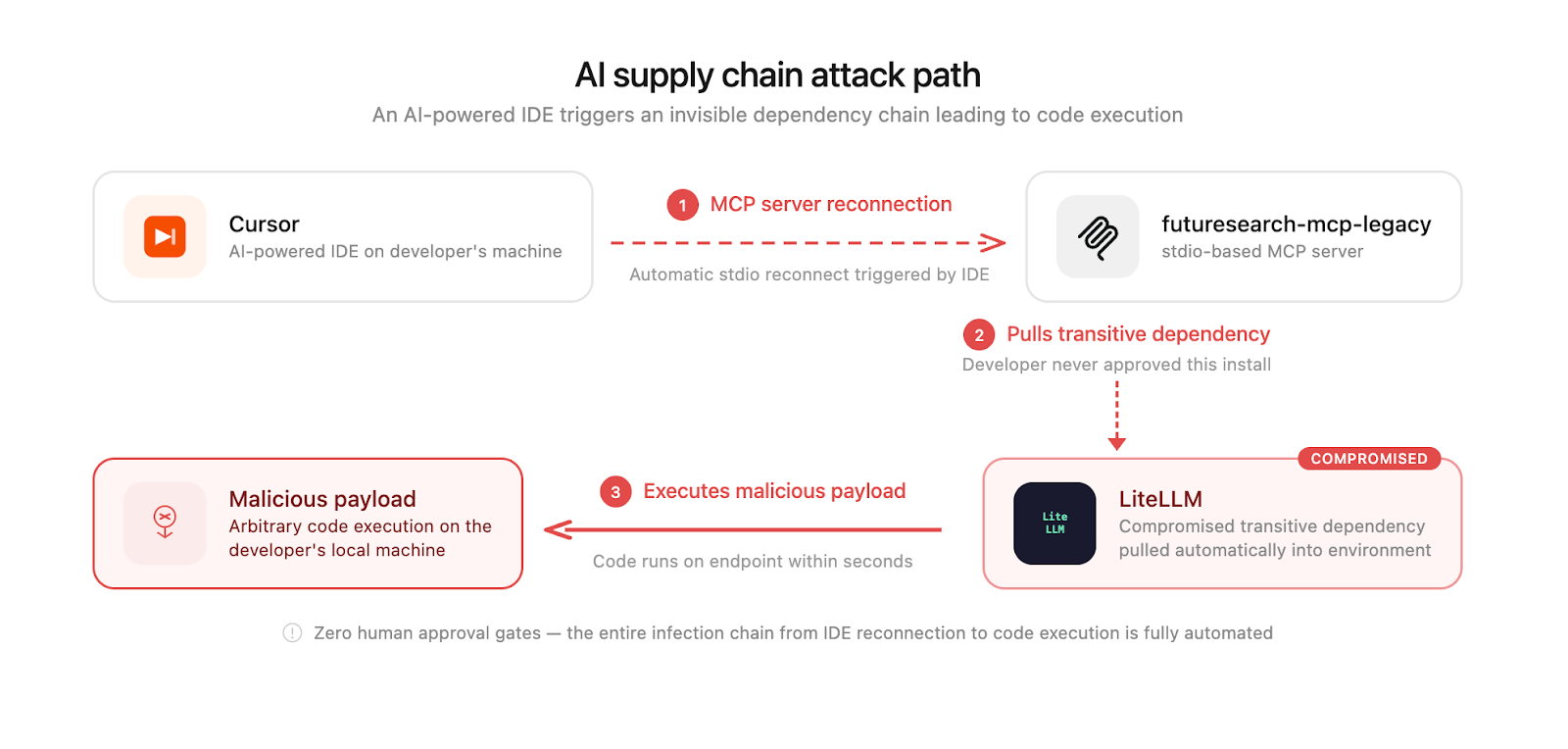 Here's what makes this attack emblematic of the AI age: the infection chain was Cursor → futuresearch-mcp-legacy (an stdio-based MCP server) → LiteLLM (transitive dependency) → malicious payload. The developer never chose to install LiteLLM. They never approved the download. An AI-powered IDE triggered an MCP server reconnection, which pulled the compromised package as a transitive dependency, and malicious code was executing on the endpoint within seconds.