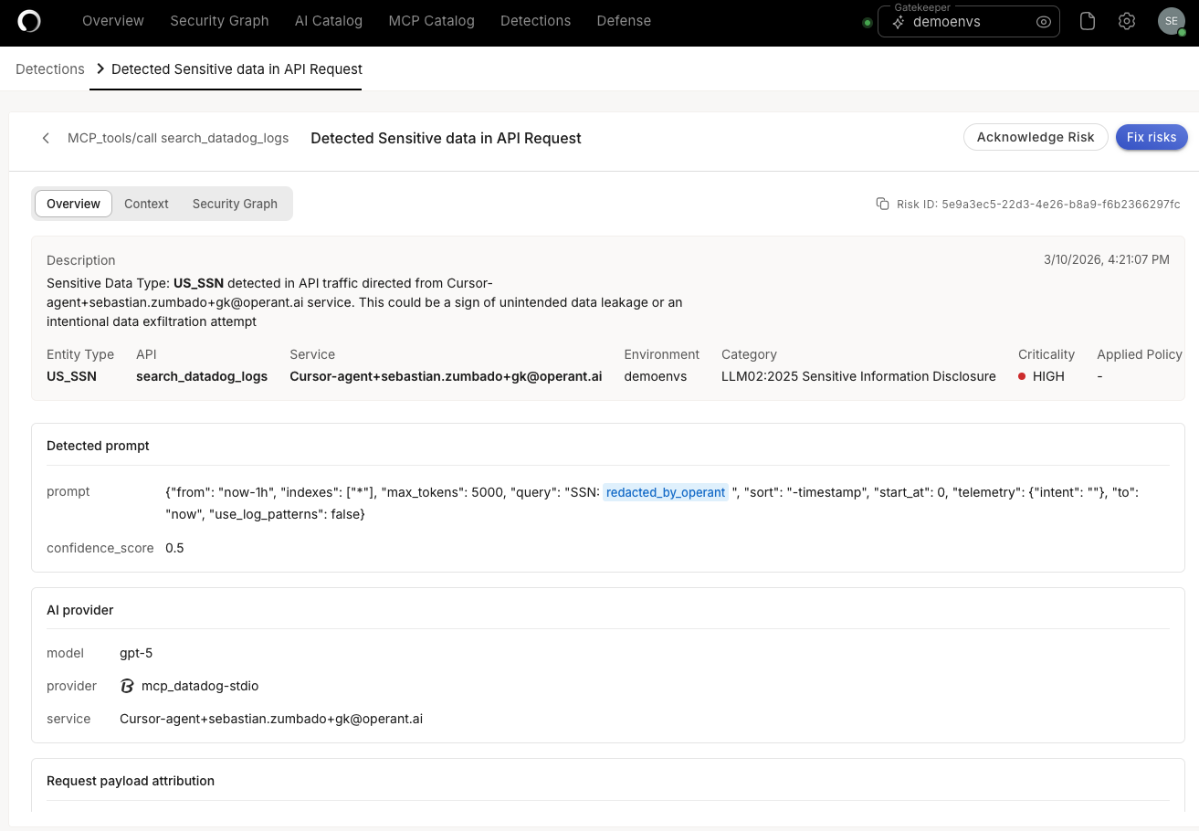 2. Inline Auto-Redaction of Sensitive Data Before any data leaves your Datadog environment and flows to an AI agent, Operant's redaction engine scrubs it — removing PII, PHI, credentials, tokens, and financial data in real time. Even if a tool is compromised or a prompt injection succeeds, it can't exfiltrate what was never exposed in the first place.